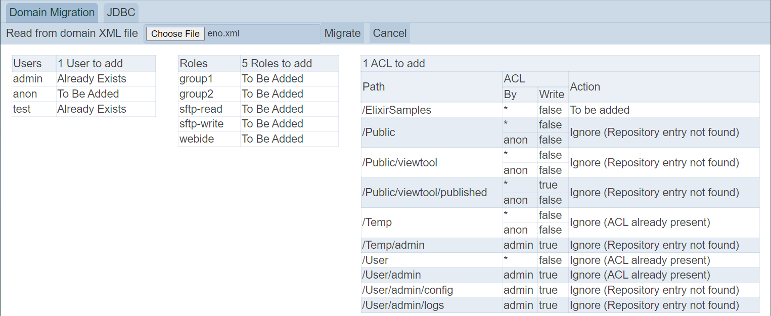 Once the configuration XML has been uploaded, a list of users, roles and ACLs found in the configuration will be displayed for review.