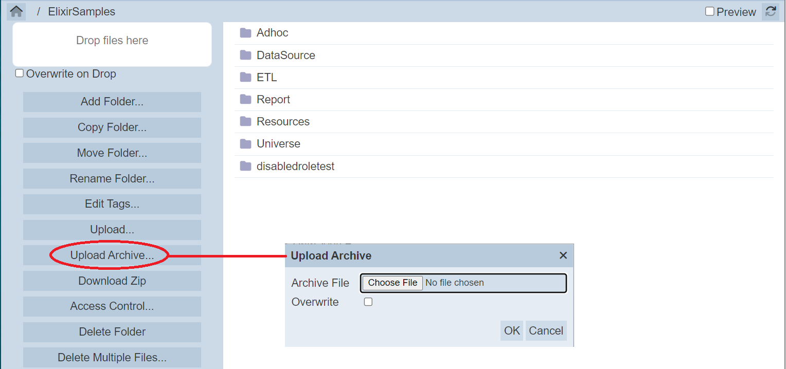 In the desired folder, click on the “Upload Archive” button on the left panel.