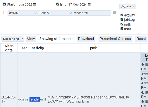 You can add filters by clicking on the desired cell field, for example, render-docx in the “activity” column. The filter will automatically fills up. By default, the “Equal” operator is selected. If it is not the desired operator, click on the “Equals” operator and select the desired operator from the drop-down list.