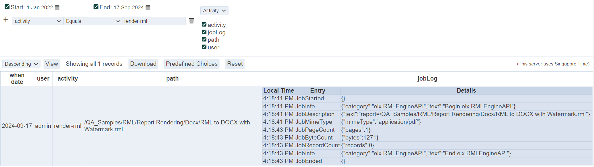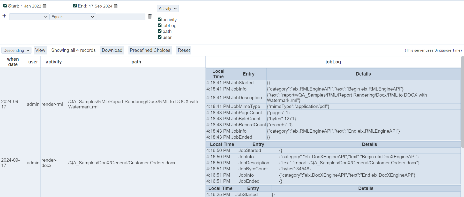 The Activity Logs allows you to view historic Ambience data generation and report rendering activities. It has filters that allow you to select the desired start and end dates and filter the desired data to view. The log displays a limit of 500 records. You can also download the log in CSV or JSON format.