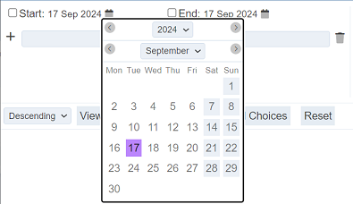 To select the start date, select the checkbox on the left of the “Start” field. By default, the current date is used. To choose another date, click in the