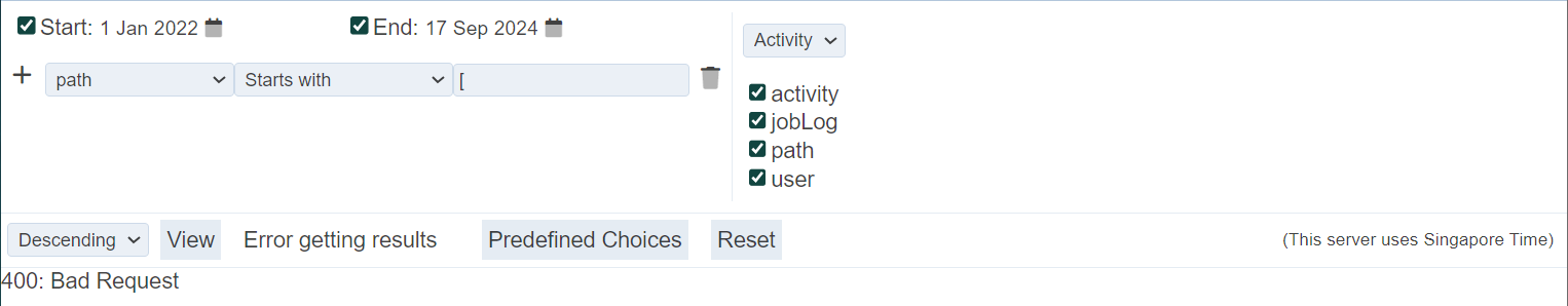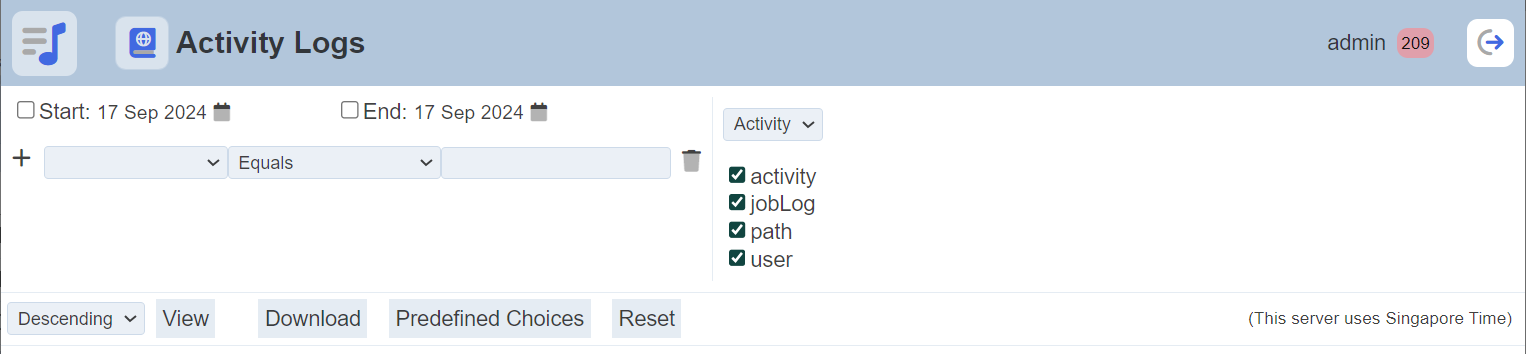 There are three panels in the Activity Logs. The left panel allows you to select the desired start and end dates, and filter for the log. The right panel allows you to select the desired column fields to be displayed and it consists of two pages; namely “Activity” and “When”.