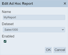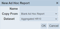 In the “Name” field, key in an unique name for the new report. You can either copy from an existing report from the drop-down list or create a blank report by selecting “Blank Ad Hoc Report” in the “Copy From” field. Select a dataset from the drop-down list in the “DataSet” field. Click on the “OK” button to create the new report or click on the “Cancel” button to abort the action.