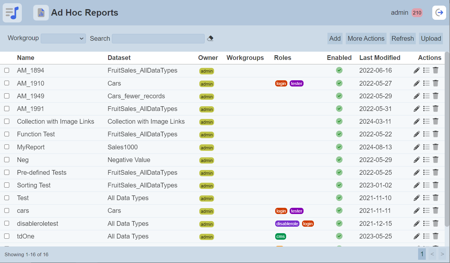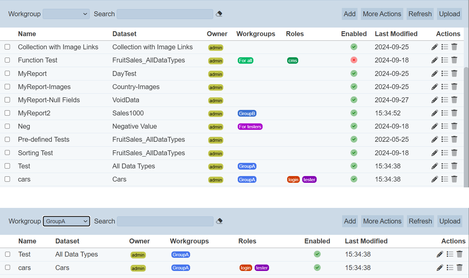 To enable or disable the reports, click on the “More Actions” button and select the “Set Enabled True” or “Set Enabled False” option respectively.