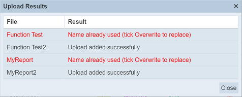Those results in black are uploaded successfully while those in red indicates upload failures with their relevant messages. Click on the “Close” button to close the dialog box.