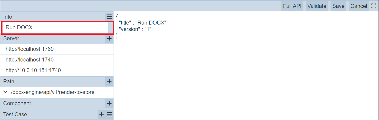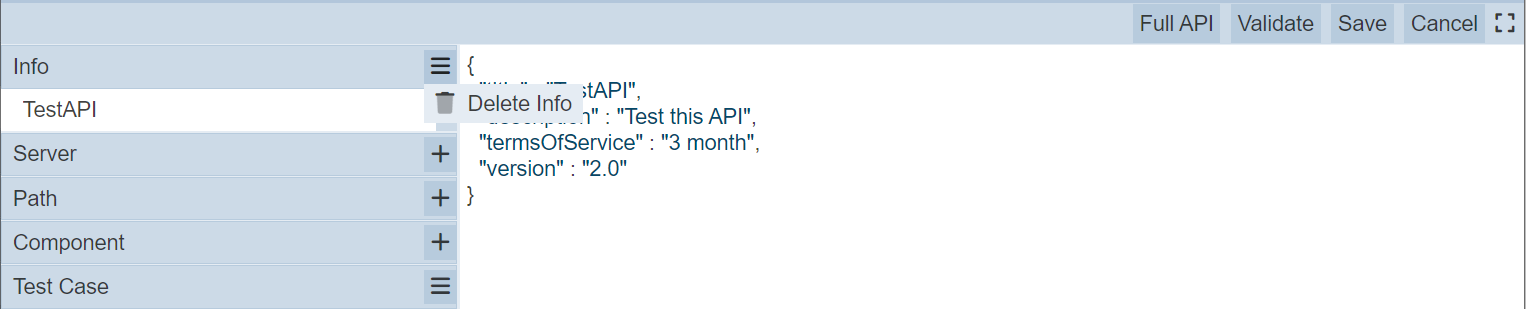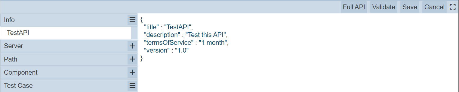 Upon successful adding the information, the details will be displayed in the right panel. The title of the API will be shown below the “Info” option and the “+” icon now changes to