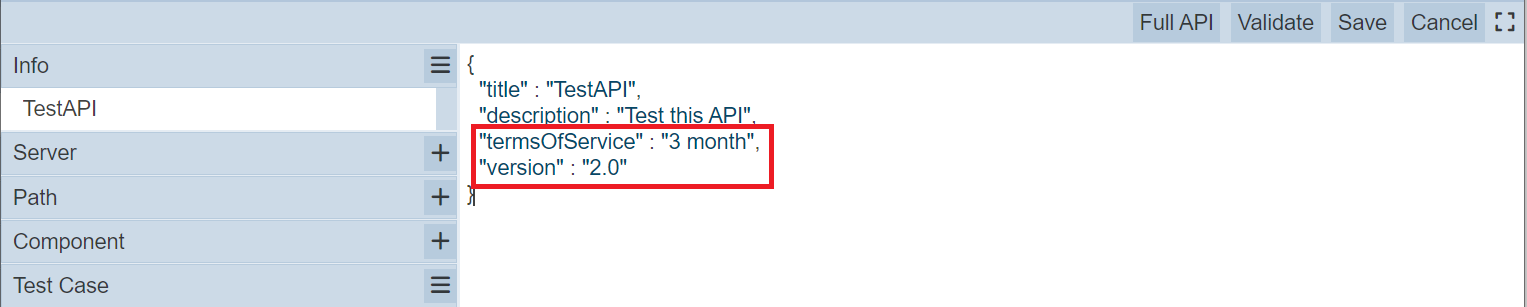 | Terms of Service | Specify the terms of the service of API. | Text field | “blank” |