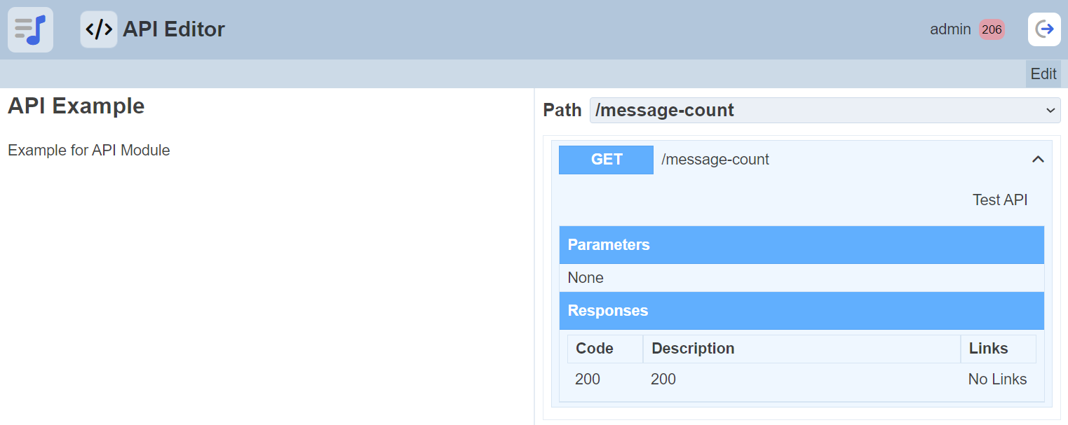 The view mode allows you to view the parameters, request body, or responses foreach APIs defined. For each API, a test function is also available which allow users to key in the required parameters and request body, and call the API to view the response of the API test call.