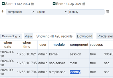 You can add filters by clicking on the desired cell field, for example, identity in the “component” column. The filter will automatically fills up. By default, the “Equal” operator is selected. If it is not the desired operator, click on the “Equals” operator and select the desired operator from the drop-down list.