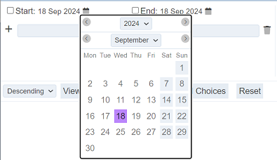 To select the start date, select the checkbox on the left of the “Start” field. By default, the current date is used. To choose another date, click in the