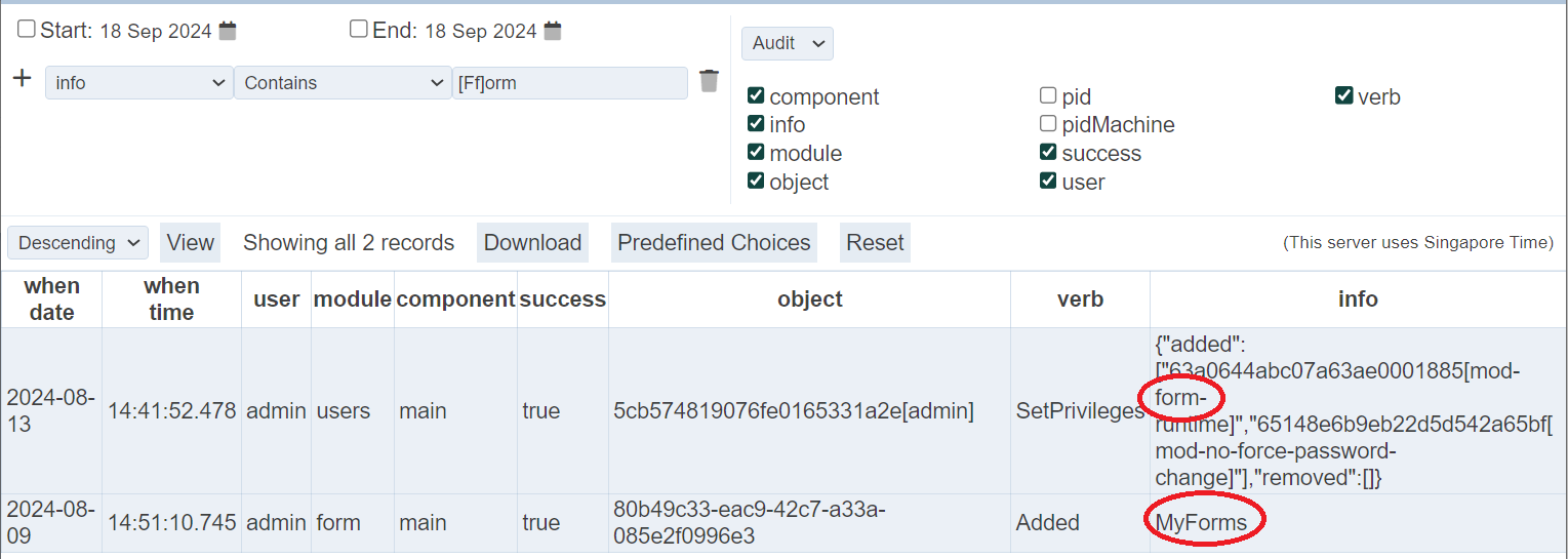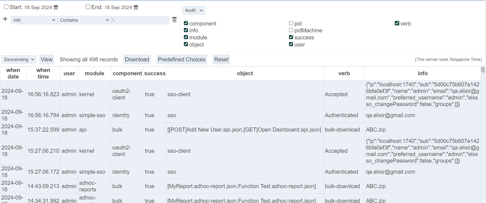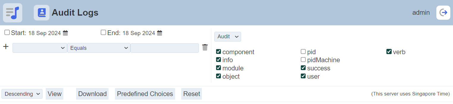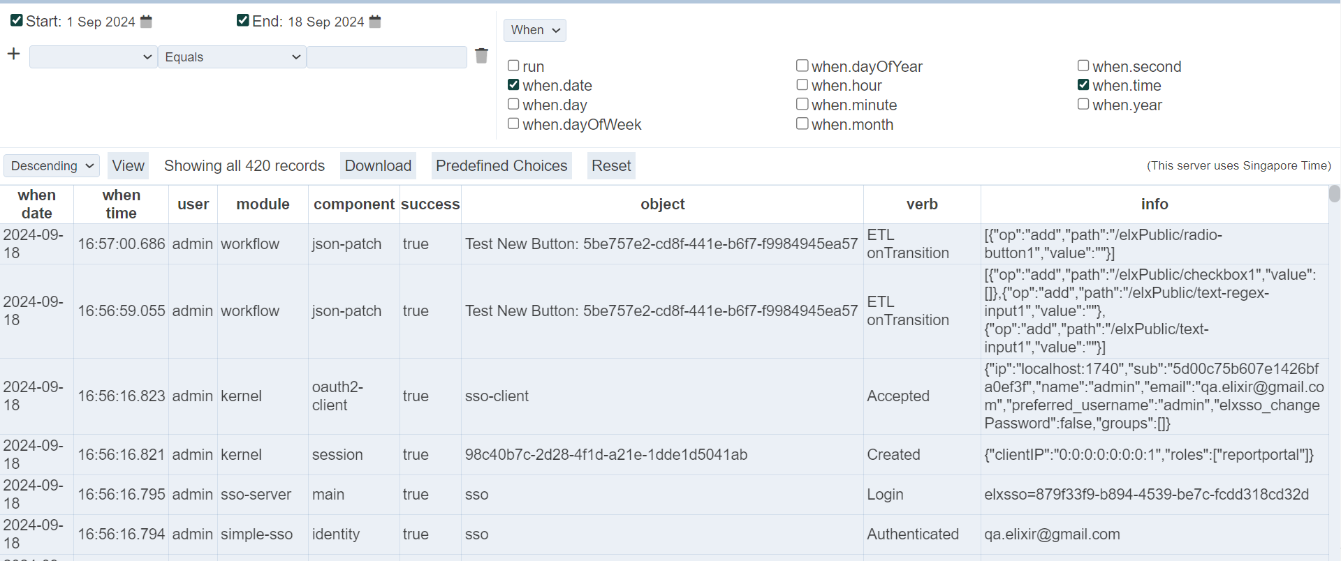 The left panel allows you to select the desired start and end dates, and filter for the log. The right panel allows you to select the desired column fields to be displayed and it consists of two pages; namely “Audit” and “When”.