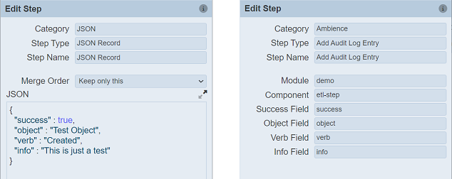 JSON RecordETL step defines the information to logAdd Audit Log EntryETL step adds the information in the JSON record into the audit log