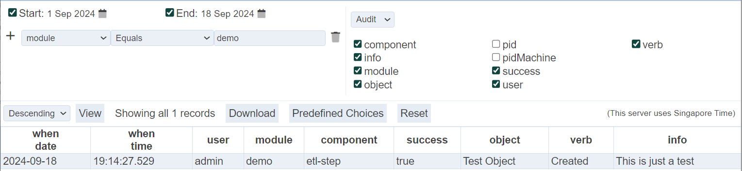 Run the ETL chainset to log the information into the audit log. In the Audit Log viewer, search for the module demo and you can view the log added.