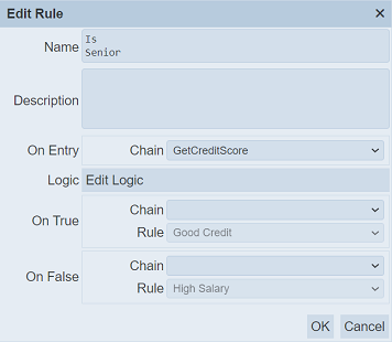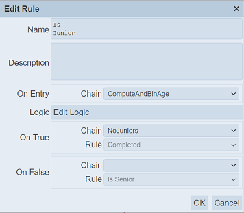 In the properties of the rule “Is Junior”, the “On Entry” field selects the “ComputerAndBinAge” ETL chain. The “On True” field selects “NoJuniors” ETL chain and no ETL chain for “On False” field.