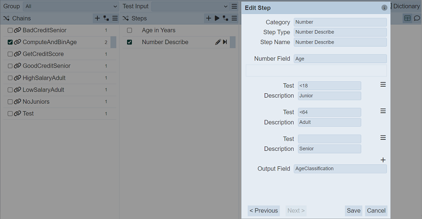 It computes the ages in years and then classifies into either Junior, Adult or Senior and returns the result in “AgeClassification” output field. This record (with the additional field) becomes the record which flows through the rest of the rules.