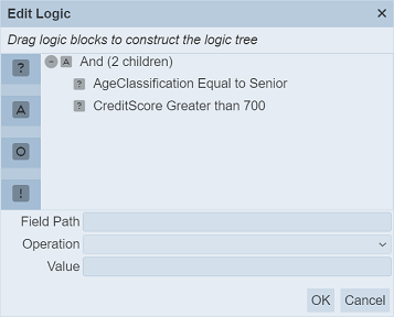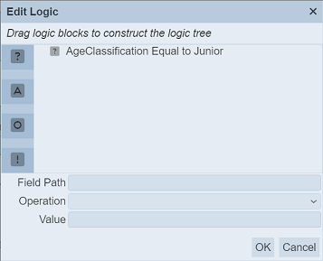 In the “Logic” field of the property for the rule, the Decision states a statement, in this case, “AgeClassification” is “Junior”.