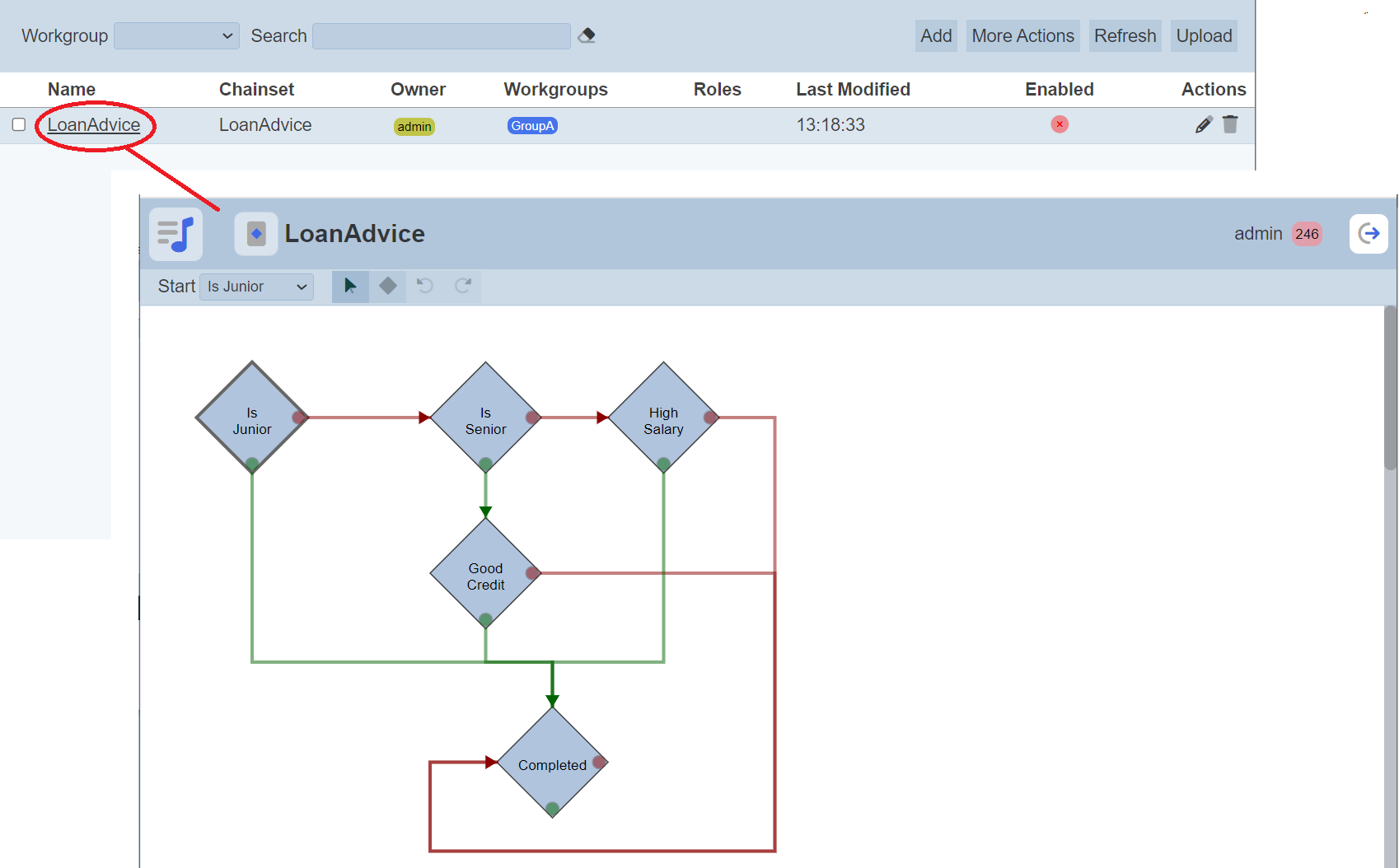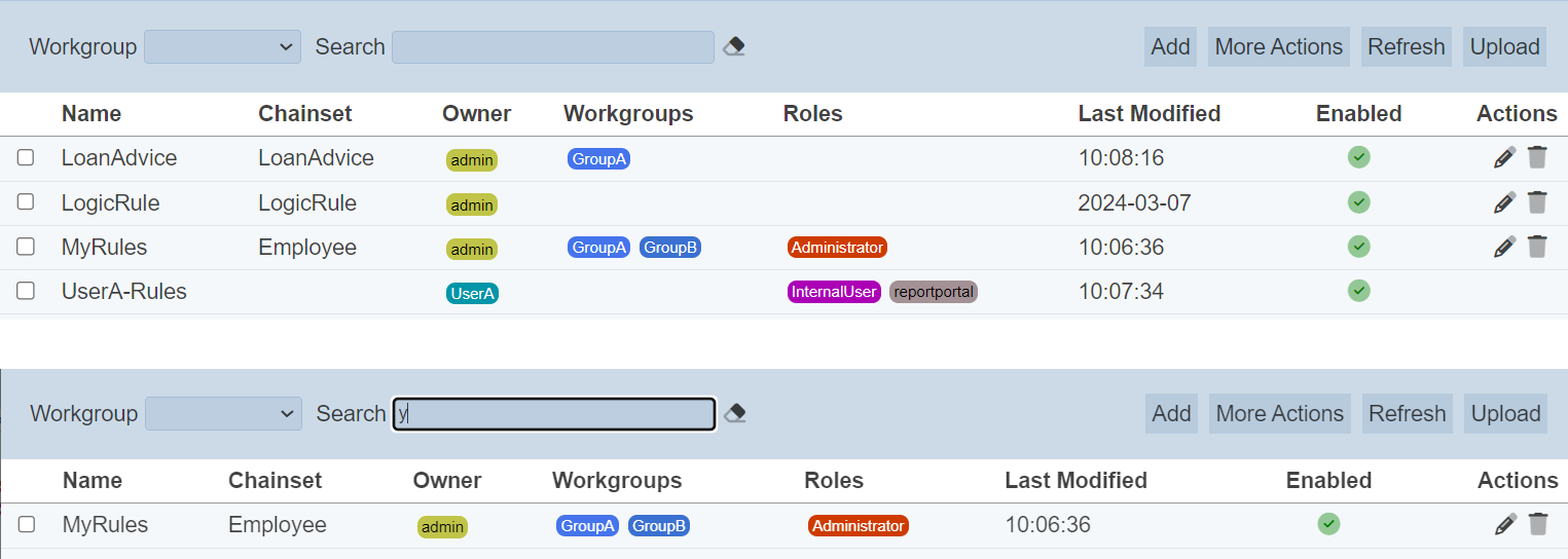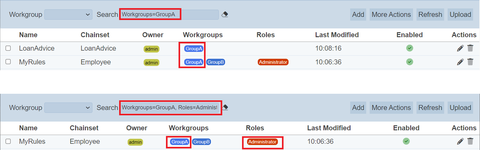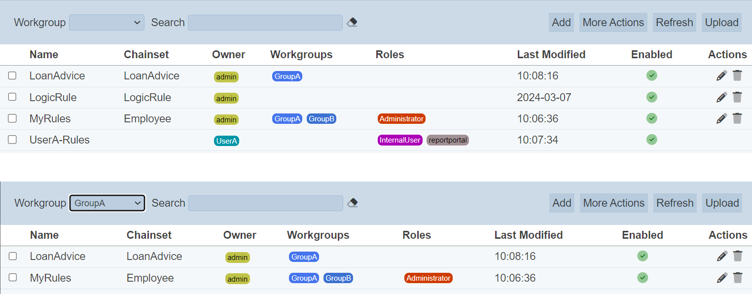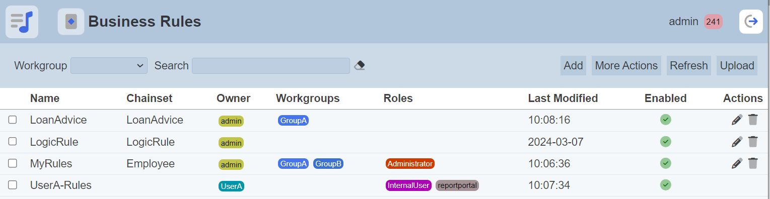 In the example above, Business Rules that are associated with workgroup “GroupA” and role “Administrator” is shown.