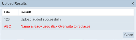 The result in black is uploaded successfully while those in red indicates upload failures with their relevant messages. Click on the “Close” button to close the dialog box.