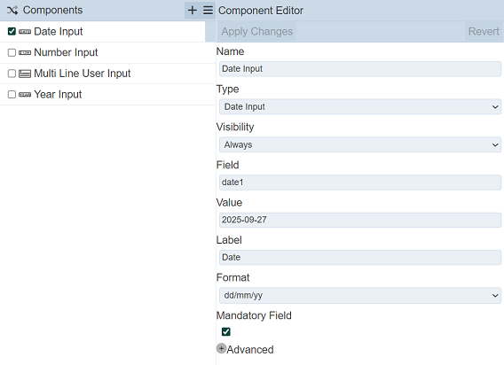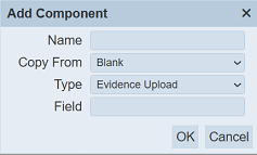 | Type | Selects the type of component. | Y | Select | One value can be selected. Options are: <br.- Evidence Upload - button - Checkbox - Date Input - Number Input - Text - Multi-Select - Radio Button - Select - Multiple Line User Input - Single Line User Input - Year Input |