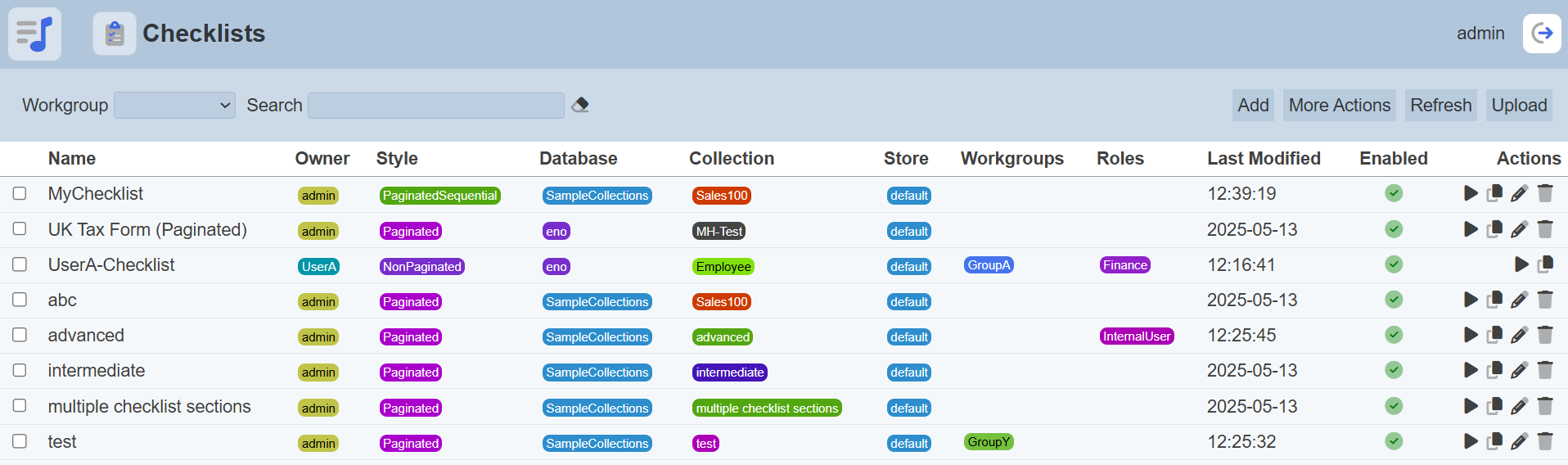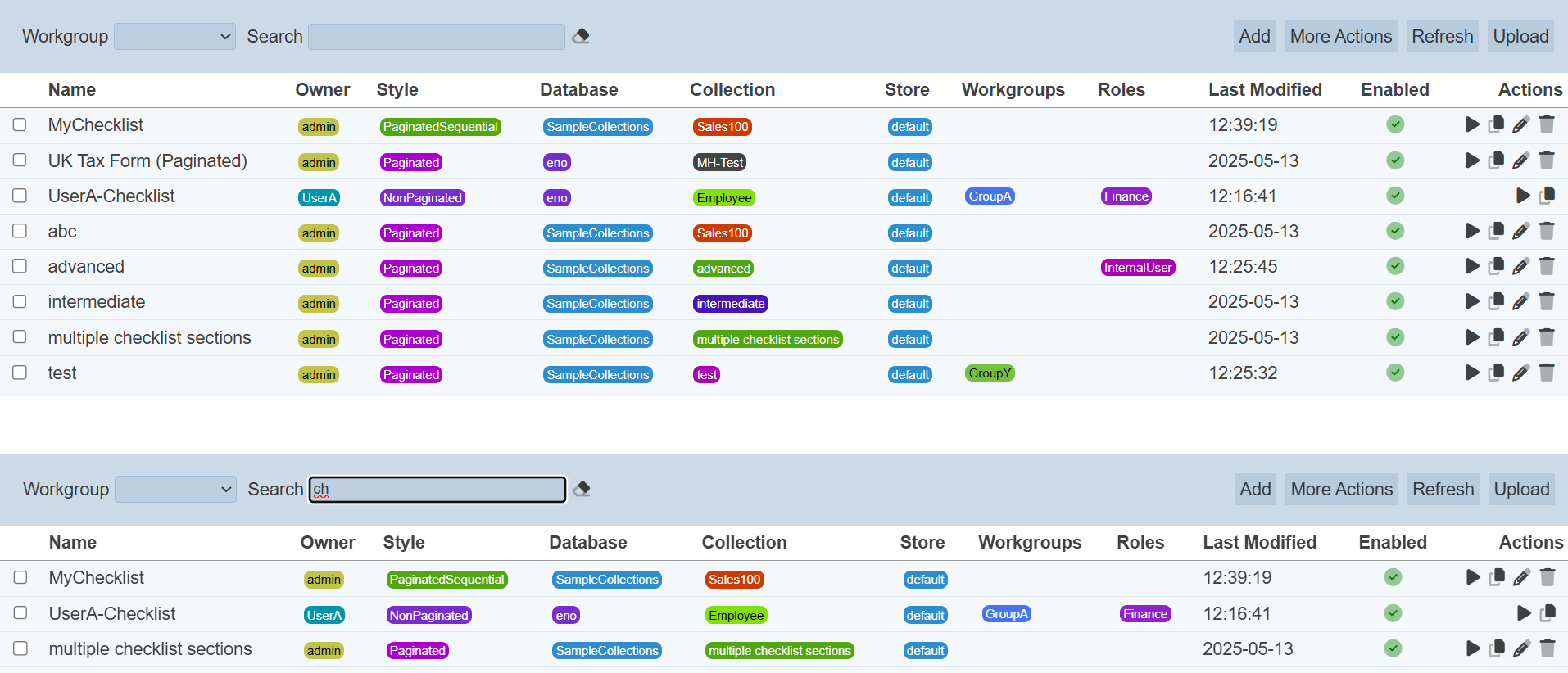 The “Workgroup” field at the top left corner of the page allows you to filter the checklists associated with the selected workgroup.