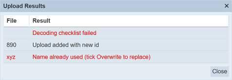 If the name of the checklist to be uploaded already exist or the file is not provided, the relevant error message will appear.