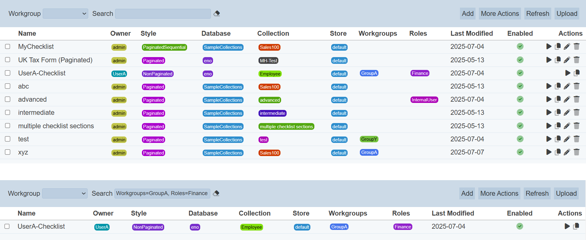 In the example above, checklist that is associated with workgroup “GroupA” and role “Finance” is shown.