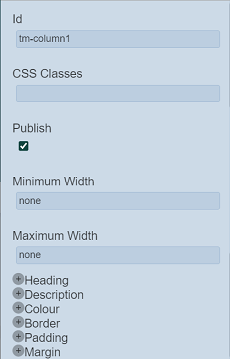| Common Properties | Common properties. - CSS Classes - Publish - Font - Colour - Border - Padding - Margin See Common Properties for more details. |