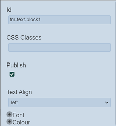 | Id | Name of the Text Block that will be displayed in the tree structure. | “tm-text-blockX” |