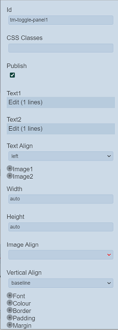 | Id | Name of the Toggle Panel that will be displayed in the tree structure. | “tm-toggle-panelX” |