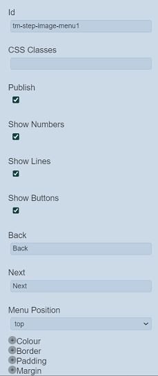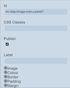 | Id | Name of the Step Image Menu Panel that will be displayed in the tree structure. | “tm-step-image-menu-panelX” |