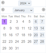 | Year | Top row displays the numeric value of the year. It has two icons on each side to navigate to the previous and next year, and updates the displayed calendar accordingly. |