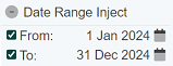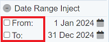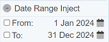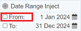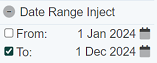 This inject control is commonly used to pass a value in document structure to other Ambience components as a child element of $elx-etl-inject. This has two input fields that allows date range selection, which includes both start and end dates. One date picker is provided for each. There is also an option to enable and disable the start (From) and end (To) date selectors. This is suitable for passing date values.