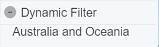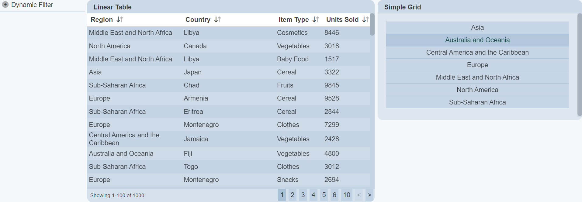 Select a region in the Simple Grid, in this case “Australia and Oceania” is selected. The Dynamic Filter displays “Australia and Oceania” in the Filter Control Panel and Linear Table displays only the content of Australia and Oceania.