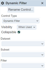 | Filter | Defines the field to be used as a control in the Dashboard Viewer. | Y | Drop-down list | Select from drop-down list | Empty |