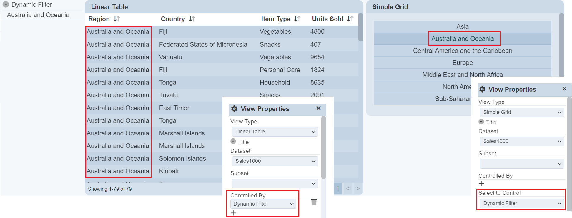 Then the Dynamic Filter Control can be used to display one region at a time by selecting the desired region in the Simple Grid, and the other view displays the information of the selected region.
