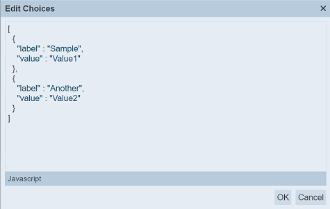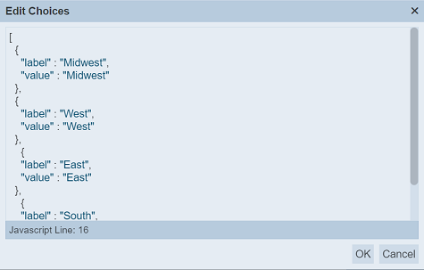 In the “Parameter Name” field, key in “Demo” as defined in the aggregation pipeline example. To edit the code in the “Choices” field, click on the textbox and the “Edit Choices” dialog box will appear with a sample code.