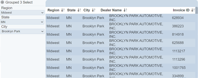 Only the values on the Filter tier are actually being filtered. The available options on the Group 2 tier are dependent on the value selected on the Group 1 tier. Selecting a value for the Group 1 tier filters out all options in the Group 2 tier that do not fall under the group. For instance, if “MN” is not grouped under “South”, the user has to select “Midwest” as the Group 1 tier then subsequently select “MN” to be able to filter the data for this value.