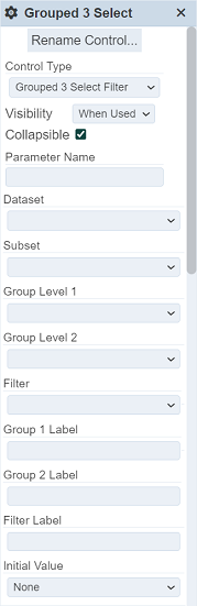 | Dataset | Name of the dataset that contains the data to be used as the control’s selector options. | Y | Select | One value can be selected. All enabled datasets are available options. | None |
