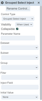 | Dataset | Name of the dataset that contains the data to be used as the control’s selector options. | Y | Select | One value can be selected. All enabled datasets are available options. | None |