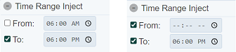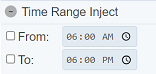 This inject control is commonly used to pass a value in document structure to other Ambience components as a child element of $elx-etl-inject. This has two input fields that allows time range selection, which includes both start and end times. A time picker is provided for each field of the control. There is also an option to enable and disable the start (“From”) and end (“To”) time selectors. This is suitable passing string values that follow the 24-hour hh:mm format (e.g. 18:00). The time picker displayed on the Viewer is using a 12-hour hh:mm time format.