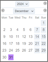 | Year | Top row displays the numeric value of the year. It has two icons on each side to navigate to the previous and next year, and updates the displayed calendar accordingly. |