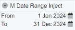 This inject control is commonly used to pass a value in document structure to other Ambience components as a child element of $elx-etl-inject. This is a single-field filter that allows date range selection, which includes both start and end dates. One date picker is provided for each. When the control is enabled, both “From” and “To” fields applied. This is suitable for passing date values.