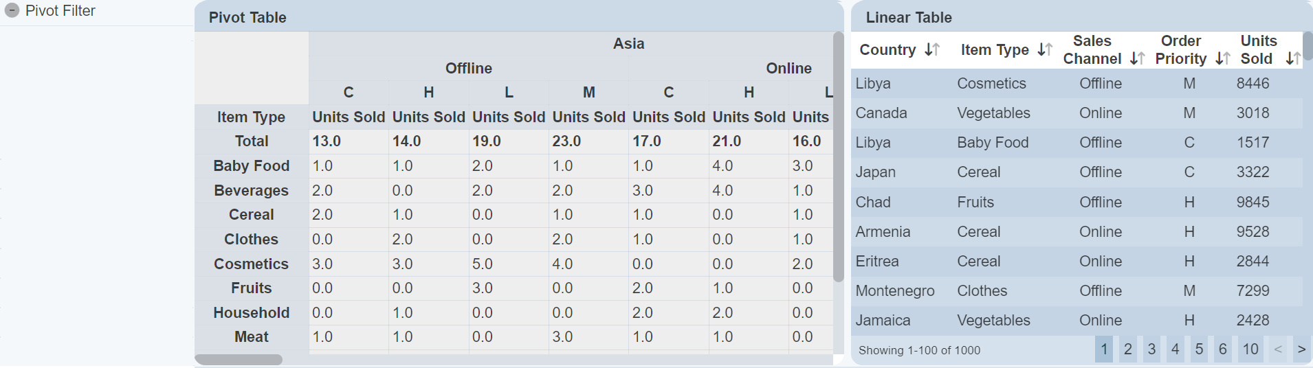 The example below shows two tables, a pivot table and a linear table. The pivot table has the columns showing “Region”, “Sales Channel” and “Order Priority” and the rows showing “Item Type”. The linear table shows details. A Pivot Filter is crated, with the “Discard” field set as “Sales Channel”.