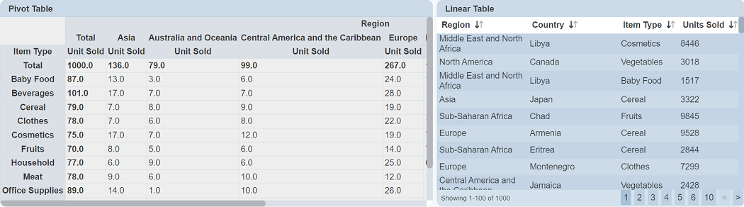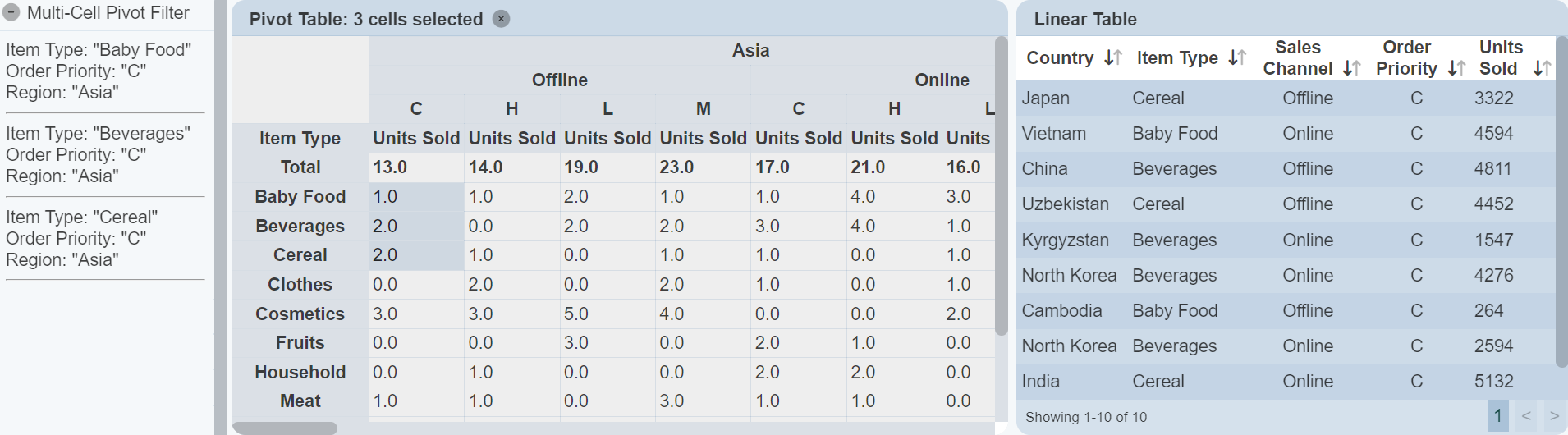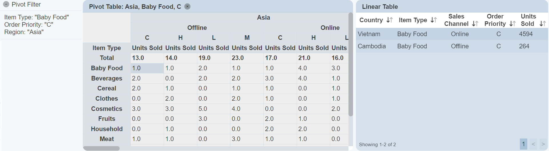 You can notice that the linear table displays records that are in “Asia”, “C” and “Baby Food”, disregarding the value of “Sales Channel”. Try selecting the cell under “Asia”, “Online” under “Baby Food”. The result in the linear table is the same.