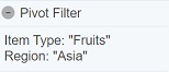 Select any value in the cell in the pivot table. In this example, “Fruits” and “Asia” is selected. If the “Visibility” property in the “Pivot Filter” is set to “Always”, you will see your selection in the Filter Control Panel.