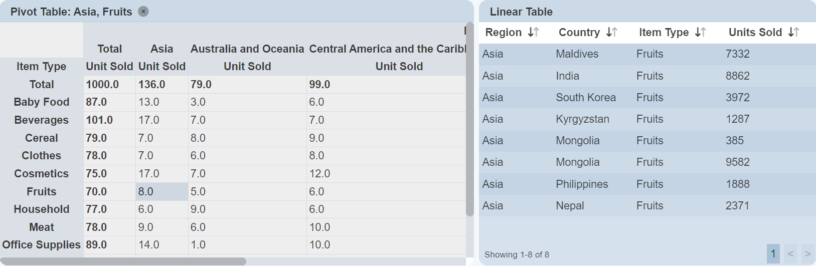 At the same time, the header row of the pivot table displays the selected item and the linear table now shows only the items from “Asia” and “Fruits”.