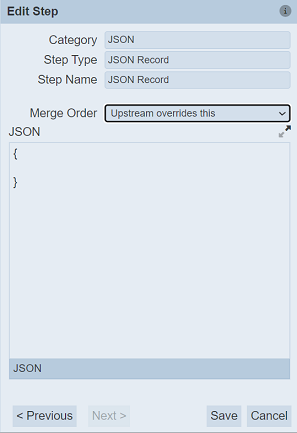 The chain to be used as an ETL dataset must start with a “JSON Record” step, with “Merge Order” set to “Upstream overrides this”. It allows the inject control fields to overwrite this JSON record.