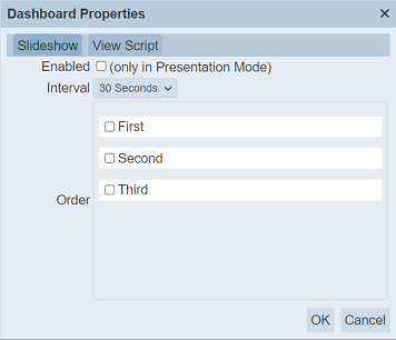 By default, the “Presentation Mode” only shows the currently selected dashboard page. This set of dashboard properties allows disabling and enabling a slideshow of the selected pages during presentation mode.