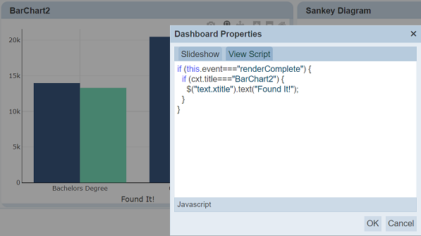 In the example below, the code in the Script tab will replace the title in the x-axis title as “FoundIt!” when the view rendering is completed.