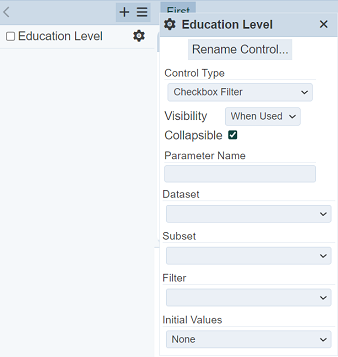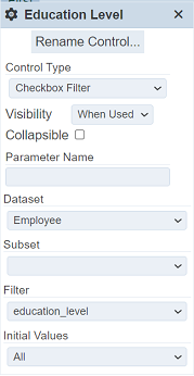 For simplicity, only filters would be used in this guide. Enter a name and select Checkbox Filter. “Education Level” is used as the name of the filter in this example. Click on the “OK” button to proceed with adding the new control. Clicking on the “Cancel” button aborts the action.